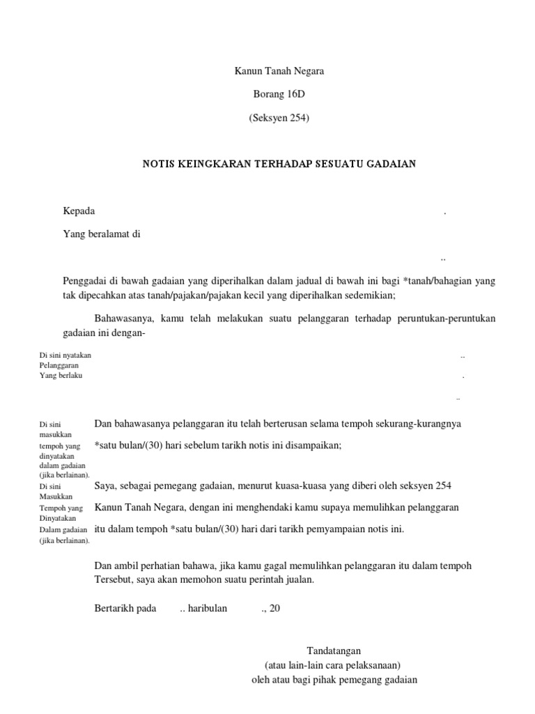 Segala maklumat dalam borang 16n boleh ditaip atau ditulis dengan terang dan jelas menggunakan dakwat hitam atau biru kehitaman. Gadaian borang 16a seksyen 242 ktn 11 gadaian borang 16b seksyen 242 ktn 12 penangguhan gadaian borang 16c seksyen 247 ktn 13 senarai semak bagi urusan pendaftaran perintah jualan oleh mahkamah borang 16f seksyen 259 ktn 14 melepaskan gadaian borang 16n seksyen 278 ktn 15 pemeberian isemen borang 17a seksyen 286 ktn 16. Pelepasan gadaian borang 16n permohonan pembatalan pajakan borang 18a permohonan untuk penyingkiran kaveat swasta borang 19h permohonan untuk kemasukan kaveat persendirian borang 19b notis penyingkiran kaveat yang dicadangkan borang 19c. Gadaian borang 16b seksyen 242 ktn 12.