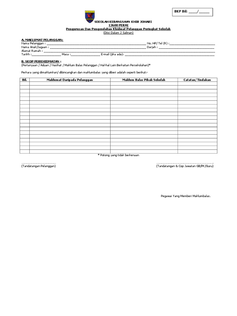 Menyediakan arahan borang panduan perkhidmatan dan maklumat maklumat berkaitan yang mudah difahami serta tidak mengelirukan pelanggan. Contoh borang aduan borang aduan pelanggan bertulis lisan.