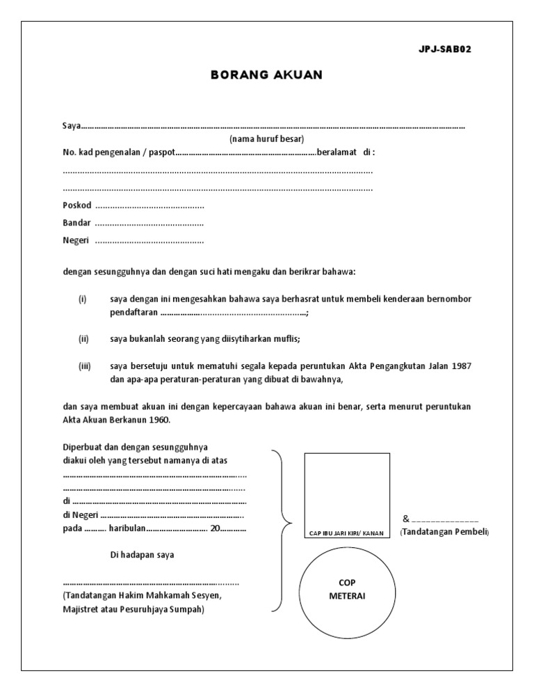 Jpj sudah menambahbaik sistem mereka dengan aplikasi biometrik untuk mengurangkan urusan tidak perlu seperti mendapatkan pengesahan pesuruhjaya sumpah. 0 0 mendukung tandai dokumen ini sebagai bermanfaat 0 0 menolak tandai dokumen ini sebagai tidak bermanfaat tanamkan. Simpan simpan borang akuan pembeli jpj sab02 2 untuk nanti. Iii saya bersetuju untuk mematuhi segala kepada peruntukan akta pengangkutan jalan 1987 dan apa apa peraturan peraturan yang dibuat di bawahnya dan saya membuat akuan ini dengan kepercayaan bahawa akuan ini benar serta menurut peruntukan akta akuan berkanun 1960.
