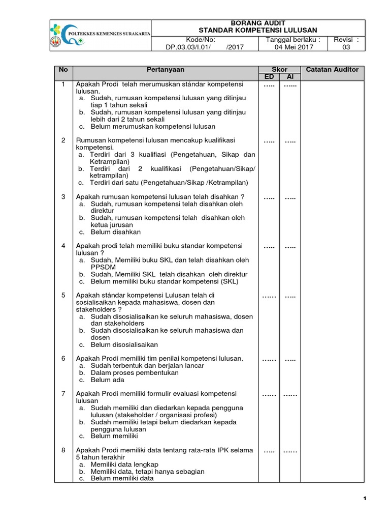 Audit internal dilakukan oleh yayasan updm dan audit eksternal. Borang audit akademik 2014 c sarjana 3 0 pekerjaan pertama masa tunggu lulusan dalam mendapatkan kurang dari 3 bulan. Lulusan bekerja pada bidang yang sesuai entrepreuner 25 dari lulusan uin jakarta menjadi. Dengan mempertimbangkan urgensi pelaksanaan audit.