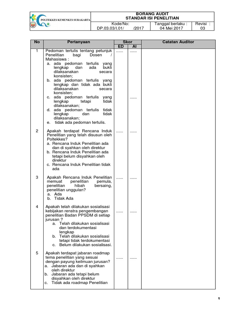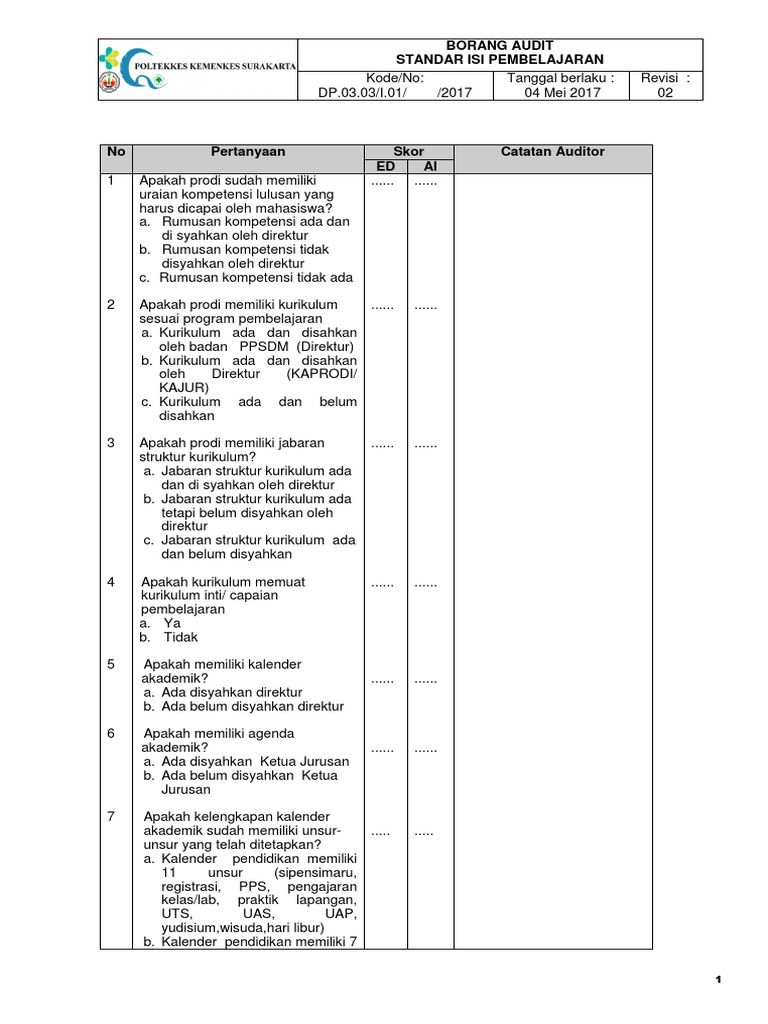 Ya dibahas pada rapat program studi tetapi tidak ada laporan d. Hal ini dibutuhkan berkaitan dengan standar 2 2 borang. Dp 03 03 i 01 2017 04 mei 2017 03 9 c. Laporan hasil audit dan rekomendasi audit internal mutu akademik aima s i k l u s 1 tahap 1.