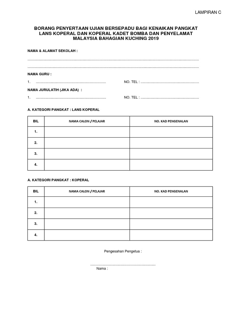Borang c bomba. Saya berhasrat untuk dilantik sebagai pegawai bomba bantuan dan saya akan. Saya kami mengaku bahawa sepanjang pengetahuan saya kami segala keterangan yang diberikan dalam borang permohonan ini adalah benar dan betul. Jalan maharajalela 50648 kuala lumpur. Semua langkah.