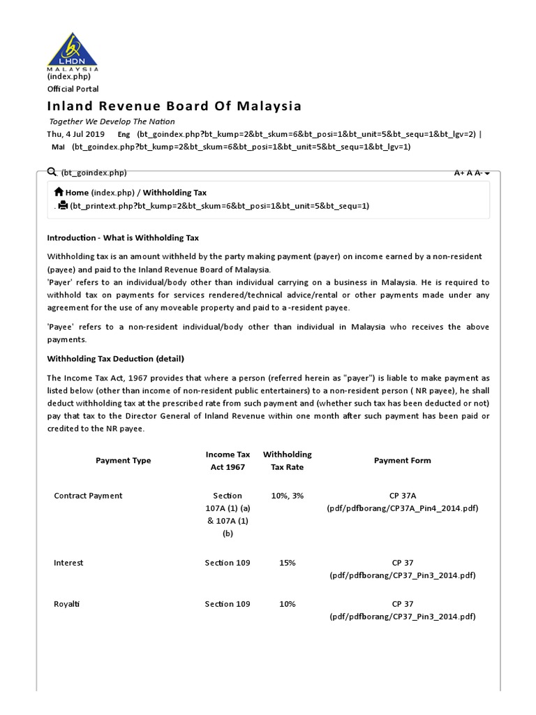Borang c p 37d. Borang cp37d mesti diisi dengan lengkap. Bayaran hanya boleh dibuat melalui pos atau di kaunter bayaran seperti dinyatakan di bawah. Cek cek yang dibayar oleh bank bank di luar malaysia tidak akan diterima. Bahagian c jika mana mana bahagian cukai yang kena dibayar tidak dibayar dalam tempoh satu bulan selepas membayar atau mengkredi tkan.