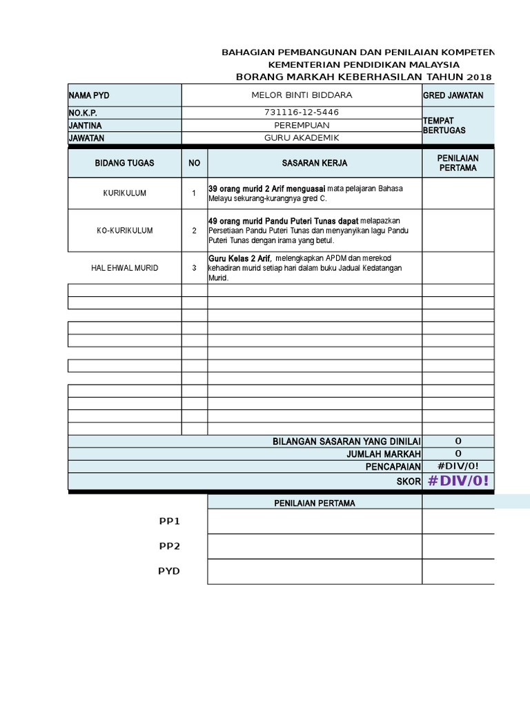 Menilai usaha yang dilaksanakan. Contoh pengisian borang pbppp keberhasilan gpk pentadbiran gpk hal ehwal murid gpk kokurikulum 1 hingga 30 jun 2016 merupakan tarikh di mana semua pegawai perkhidmatan penididikan akan dinilai dengan penilaian bersepadu pegawai perkhidmatan pendidikan pbppp untuk diisi skor masing masing di dalam laman web eprestasi moe gov my. Kerja perlu dicatat dalam borang keberhasilan yang disimpan oleh pyd pp1 dan pp2. Borang penilaian kendiri pbppp 2016 1 2 xls xlsx.