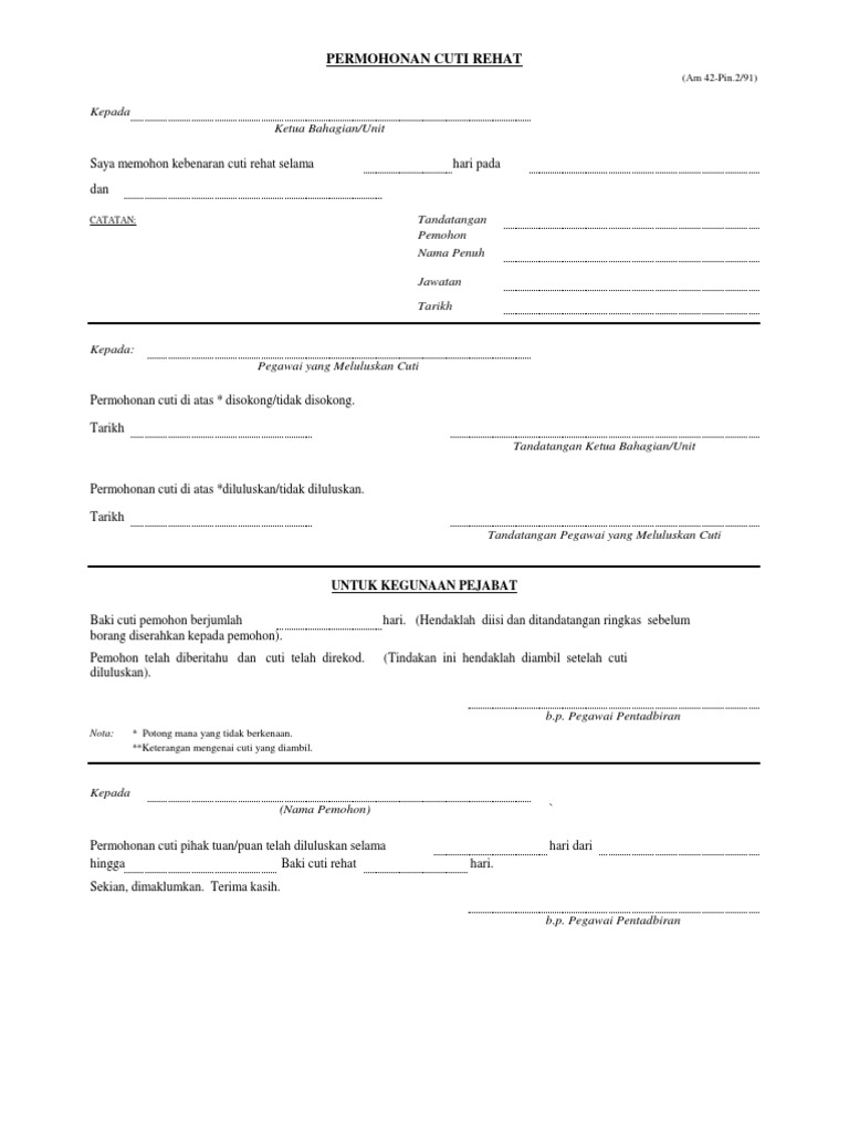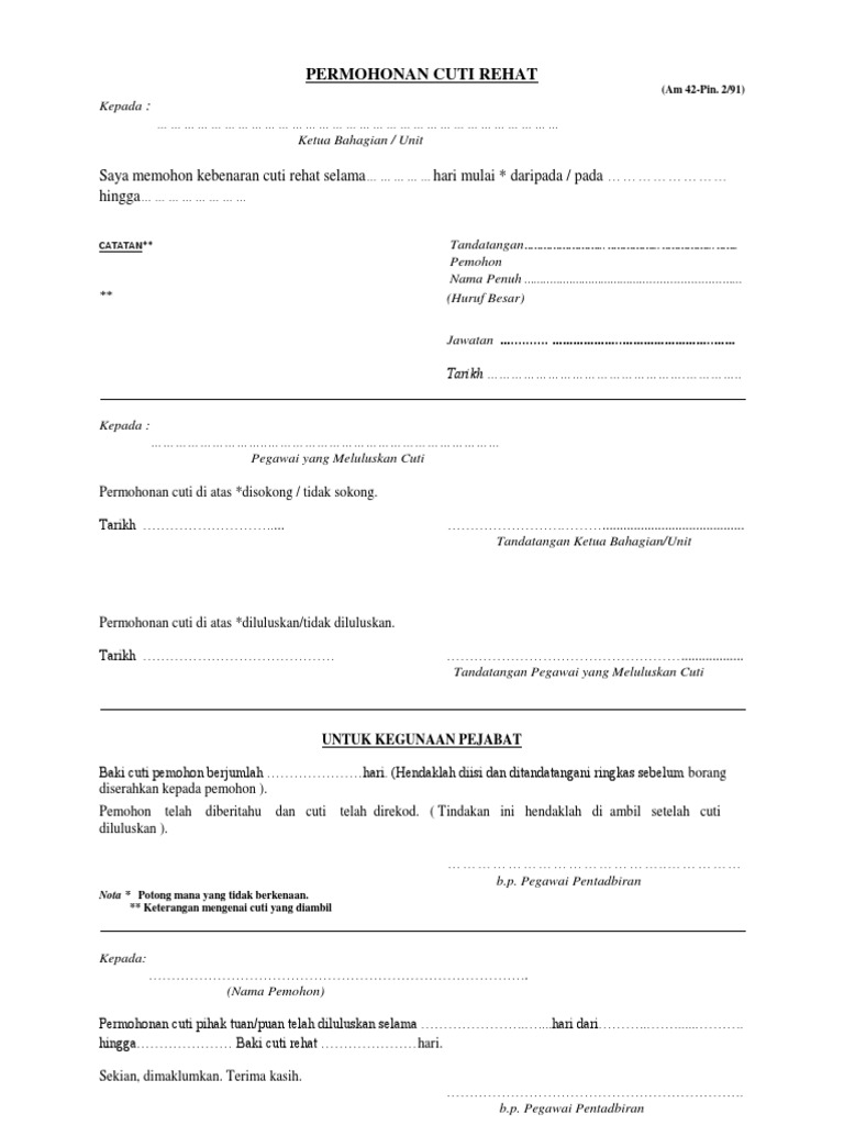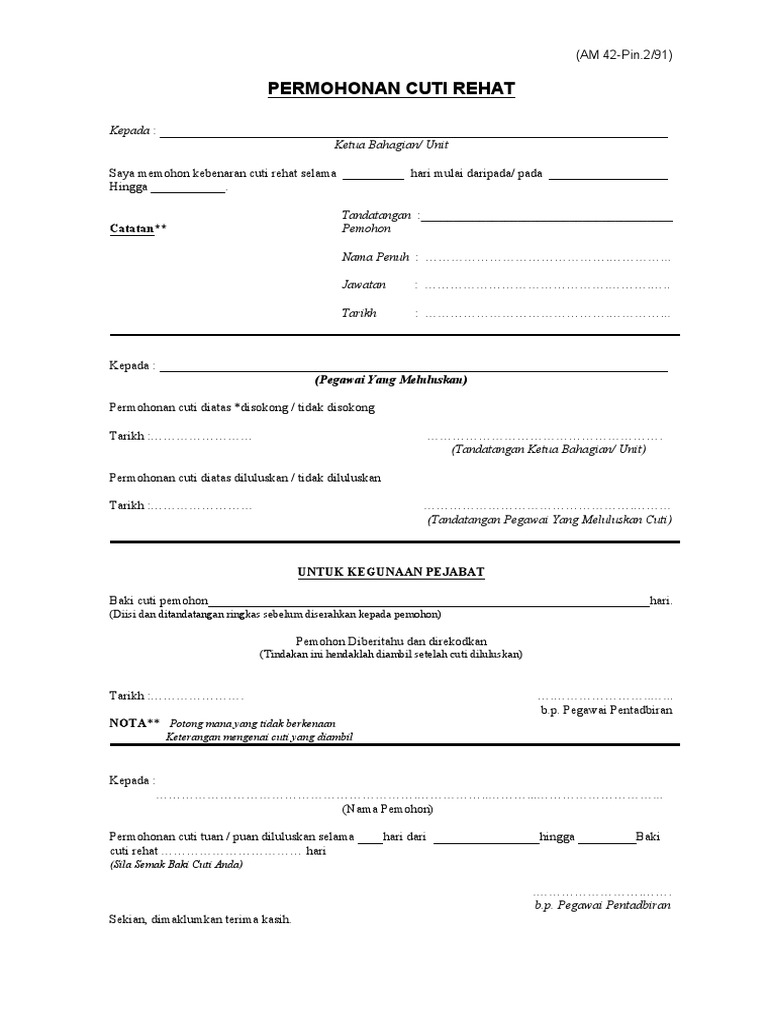 Hendaklah diisi dan ditandatangan ringkas sebelum borang diserahkan kepada pemohon. Tindakan ini hendaklah diambil setelah cuti diluluskan. Am 42 pin 2 91 permohonan cuti rehat. Microsoft word 1.
