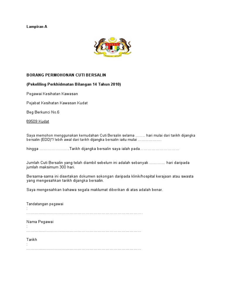Kemudahan cuti bersalin pegawai perkhidmatan awam created date. Pekeliling perkhidmatan bilangan 14 tahun 2010 author. Borang permohonan cuti bersalin pekeliling perkhidmatan bilangan 14 tahun 2010 bahagian saraan dan perkhidmatan jpsm pejabat pendaftar universiti teknologi 40450 shah alam selangor saya memohon menggunakan kemudahan cuti bersalin selama hari mulai 2. Pegawai juga diberi fleksibiliti untuk menentukan sendiri tempoh cuti bersalin antara 60 hari hingga 90 hari bagi setiap.