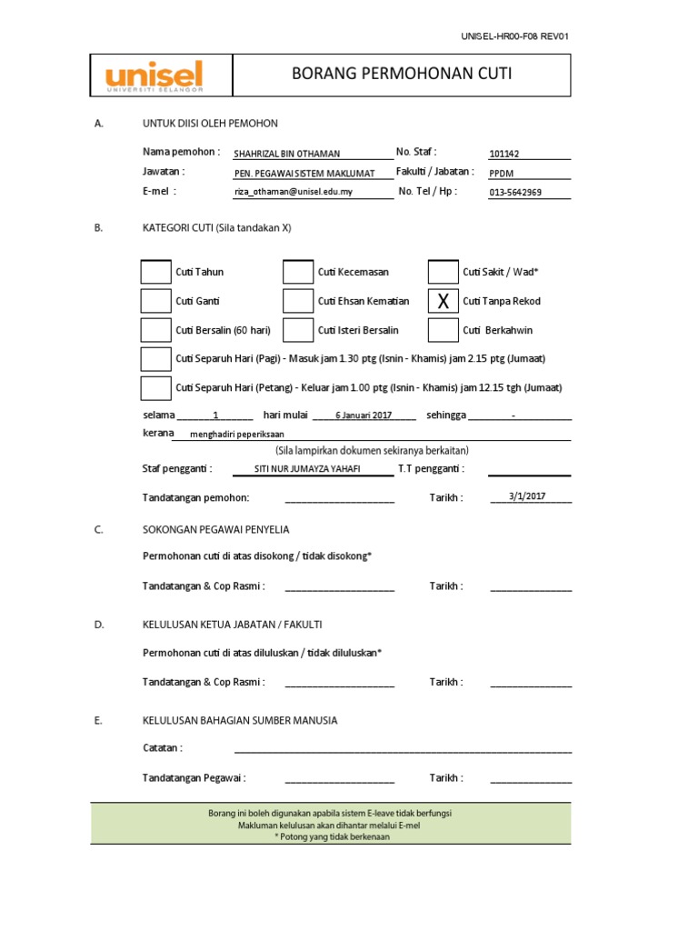 03 6120 7601 faks. Borang permohonan cuti tanpa gaji bagi pegawai yang mengikut pasangan. Employment law di malaysia. Puan ruzina dilantik sebagai jurupulih perubatan anggota gred u8 pada 1 november 1991 dengan kadar cuti rehat 25 hari.