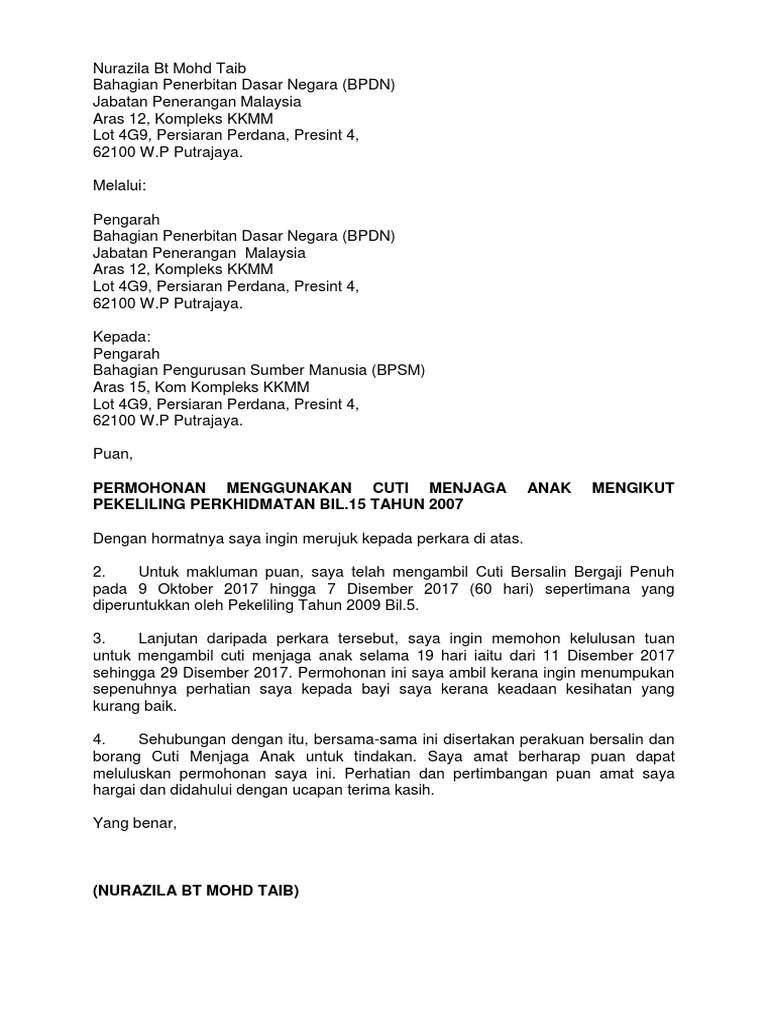 Perakuan bersalin bagi pegawai yang menggunakan cuti menjaga anak yang bersambung daripada cuti bersalin dan telah tiada baki cuti bersalin. Borang kemas kini januari 2017 1 permohonan kemudahan cuti menjaga anak cma pekeliling perkhidmatan bilangan 5 tahun 2014 arahan. Maklumat hendaklah dilengkapkan dengan jelas dan menggunakan huruf besar. Secara ringkasnya pekeliling ini mengenai persetujuan kerajaan untuk menambah tempoh cuti bersalin bergaji penuh daripada 300 hari kepada 360 hari sepanjang tempoh perkhidmatan.