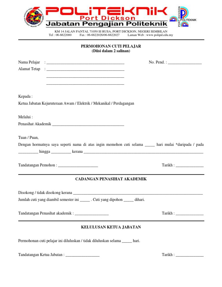 Borang cuti pelajar politeknik. Salinan permohonan cuti ini hendaklah ditampal pada jurnal refleksi. Borang cuti pelajar 30 12. Ahad rabu 8 00 pagi 5 00 petang khamis 8 00 pagi 3 30 petang jumaat sabtu cuti 09 7888739. Cop rasmi organisasi ììììi ambah.