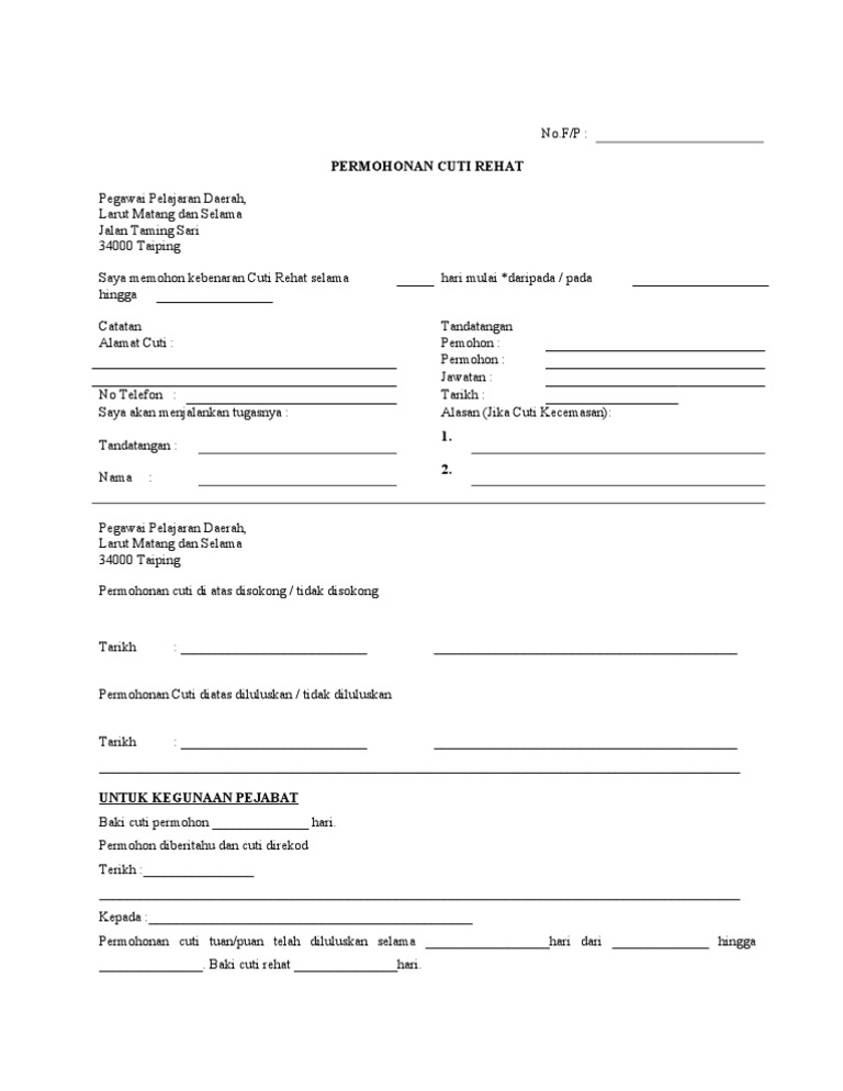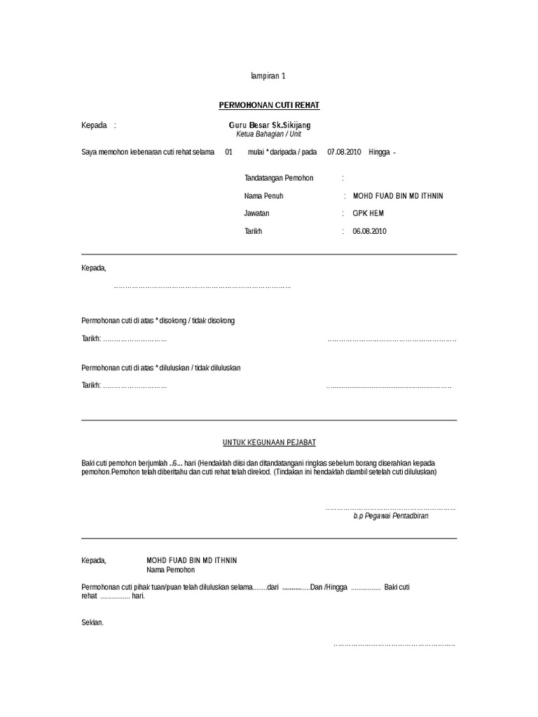 Nama pemohon permohonan cuti tuan puan telah diluluskan selama hari dari hingga baki cuti rehat hari. Iv cuti rehat yang tempohnya melebihi 28 hari berturut turut termasuk hari rehat mingguan dan hari kelepasan am. Permohonan cuti rehat am 42 pin2 91 doc author. 4 2002 atau pp bil.