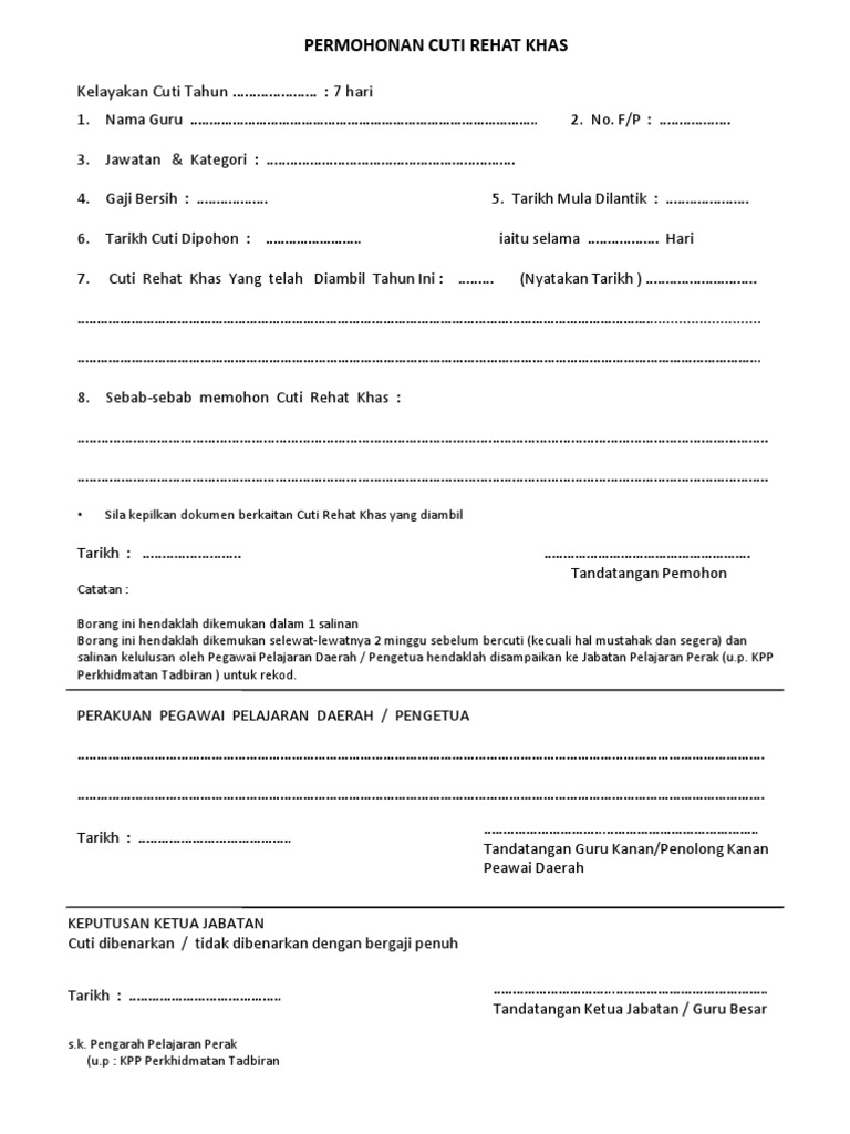 Nama pemohon permohonan cuti tuan puan telah diluluskan selama hari dari hingga baki cuti rehat hari. Ketua bahagaian unit saya memohon kebenaran cuti rehat selama. Permohonan cuti rehat author. Diisi dan ditandatangan ringkas kelayakan borang diserahkan kepada pemohon.