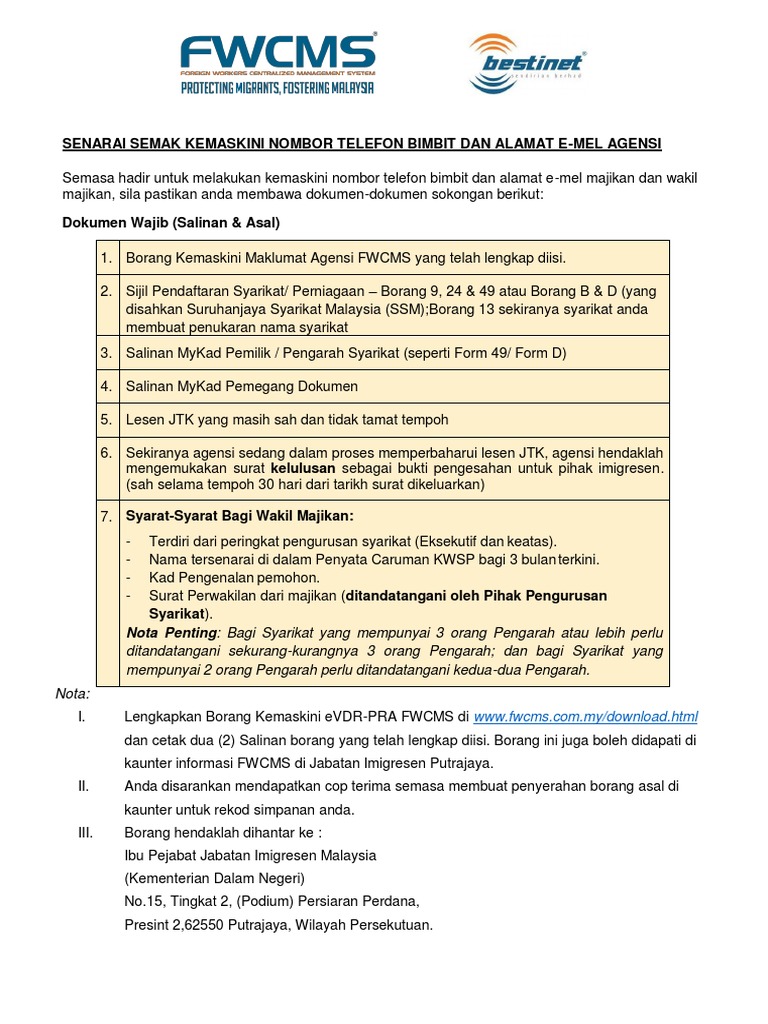 Borang kemaskini maklumat majikan fwcms yang telah lengkap diisi. Blok d1 d2 d9 kompleks d pusat pentadbiran kerajaan persekutuan 62546 putrajaya tel. Surat kelulusan kuota dari kdn. 116 27 kb 118 downloads.