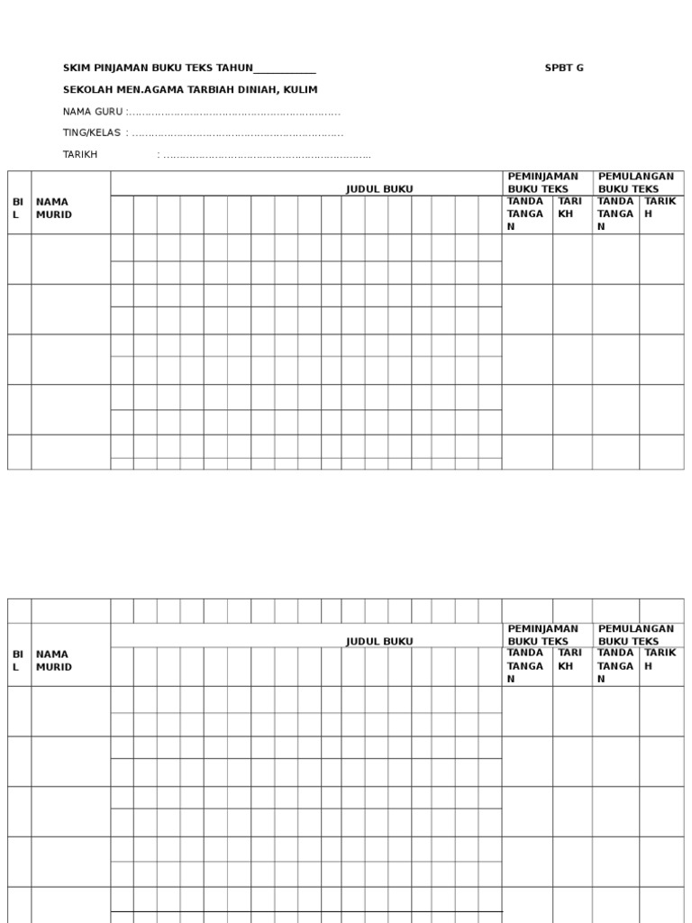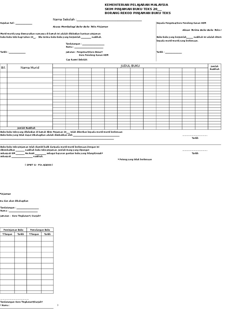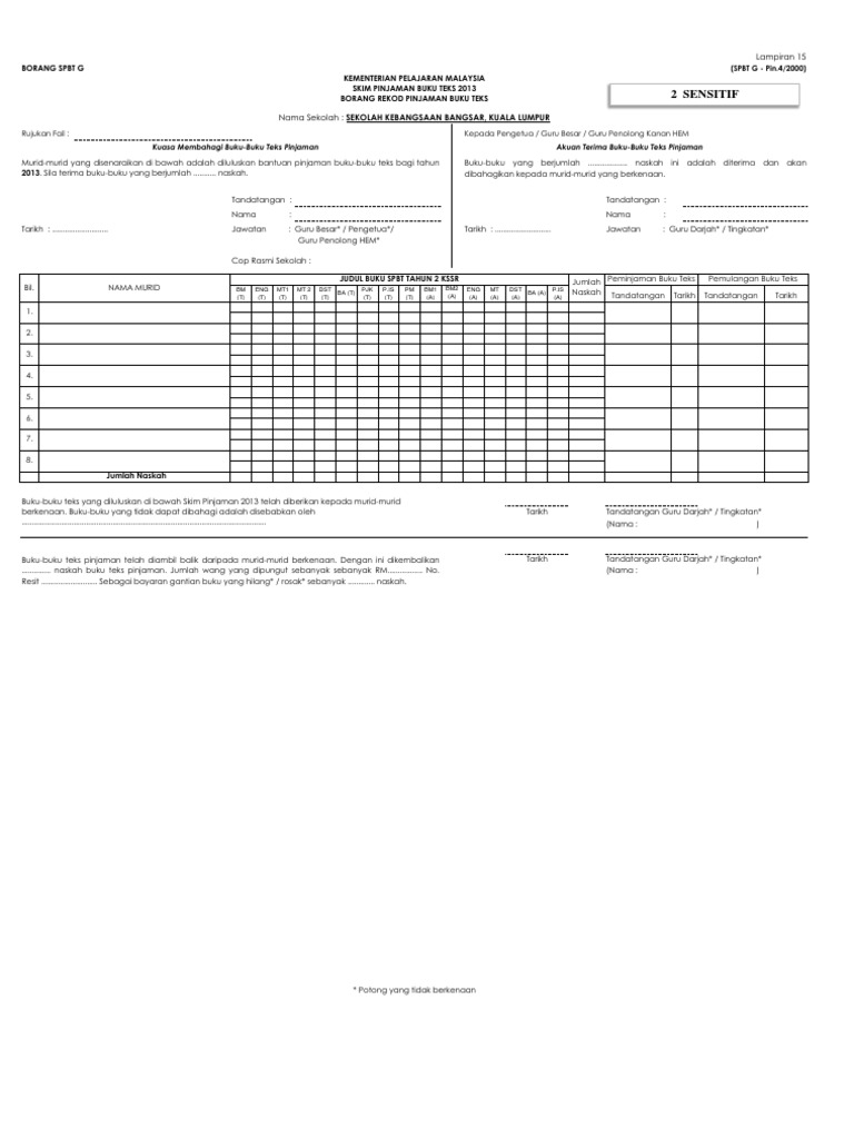 Berikut disediakan borang contoh dan borang kosong spbtg dalam bentuk excel bersaiz a4 instrumen pemantauan kendiri pengurusan buku teks dan borang pelupusan. Borang g download kelab spbt. Kementerian pendidikan malaysia borang spbt g skim pinjaman buku teks 2014 borang rekod pinjaman buku teks nama sekolah. Buku stok pengurusan spbt.