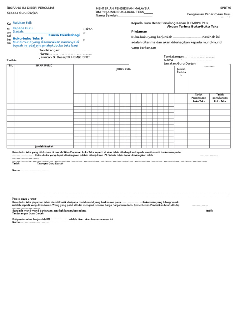 Borang g download tahun1 download tahun2 download tahun3 download tahun4 download tahun5 download tahun6 download atau borang spbt g tahun 1 2014 doc borang spbt g tahun 2 2014 doc borang spbt g tahun 3 2014 docx borang spbt g tahun 4 2014 doc. Borang skim pinjaman buku teks 1. Sk simpang pulai ipoh perakkepada guru darjah tingkatan kepada guru besar pengetua penolong kanan hem pk 1 kuasa membahagi buku buku teks pinjaman akuan terima buku buku teks pinjamanmurid murid yang disenaraikan namanya di bawah ini. Diharap guru guru dapat menjalankan pengurusan spbt dengan lebih mudah.