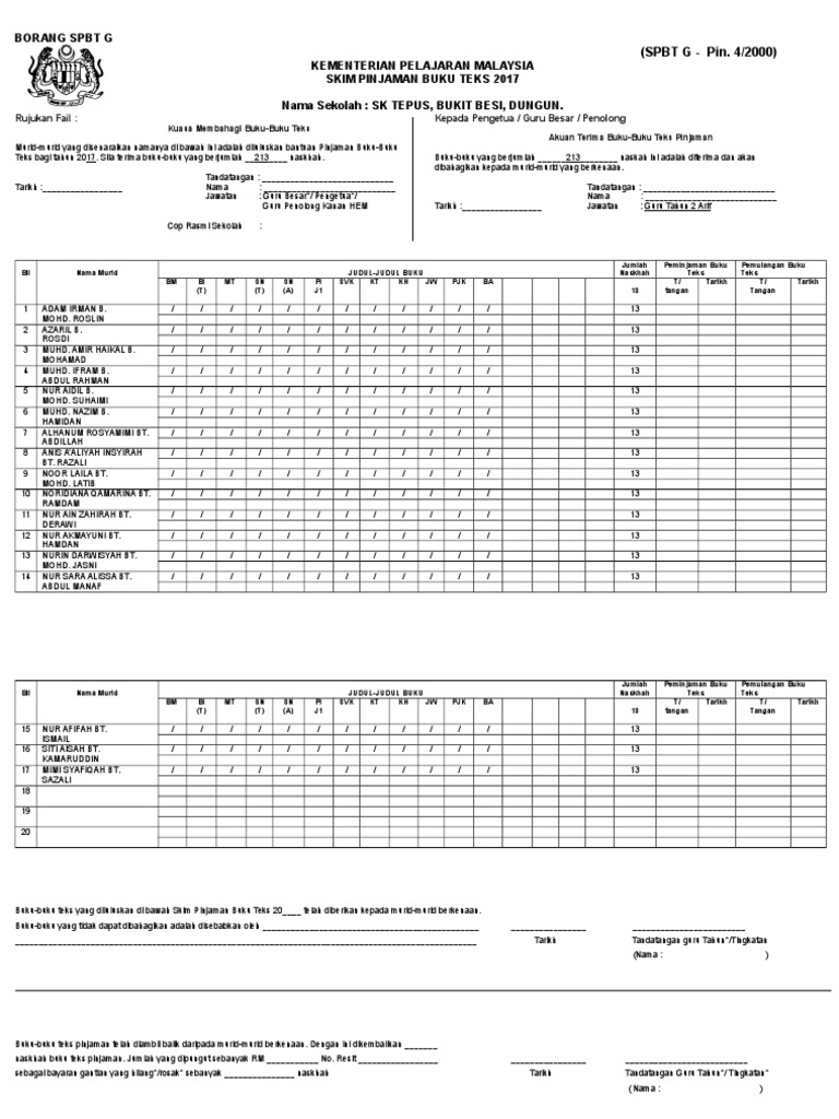 Berikut disediakan borang contoh dan borang kosong spbtg dalam bentuk excel bersaiz a4 instrumen pemantauan kendiri pengurusan buku teks dan borang pelupusan. Borang g download kelab spbt. Pihak spbt sk intan baiduri tidak akan bertanggungjawab di atas sebarang kerosakan atau kecederaan yang berlaku ketika menggunakan maklumat di dalam laman sesawang ini. Spbtskgs view my complete profile.