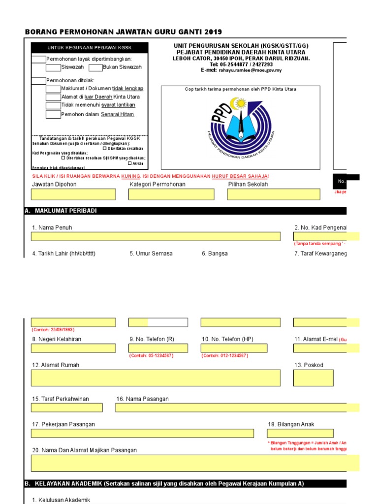 Borang guru ganti ppd kinta utara. Kedudukan perkhidmatan guru. Borang pemohonan jawatan guru ganti 2020. Syarat tambahan bagi guru ganti bahasa tamil. Borang pemohonan jawatan guru ganti 2020.