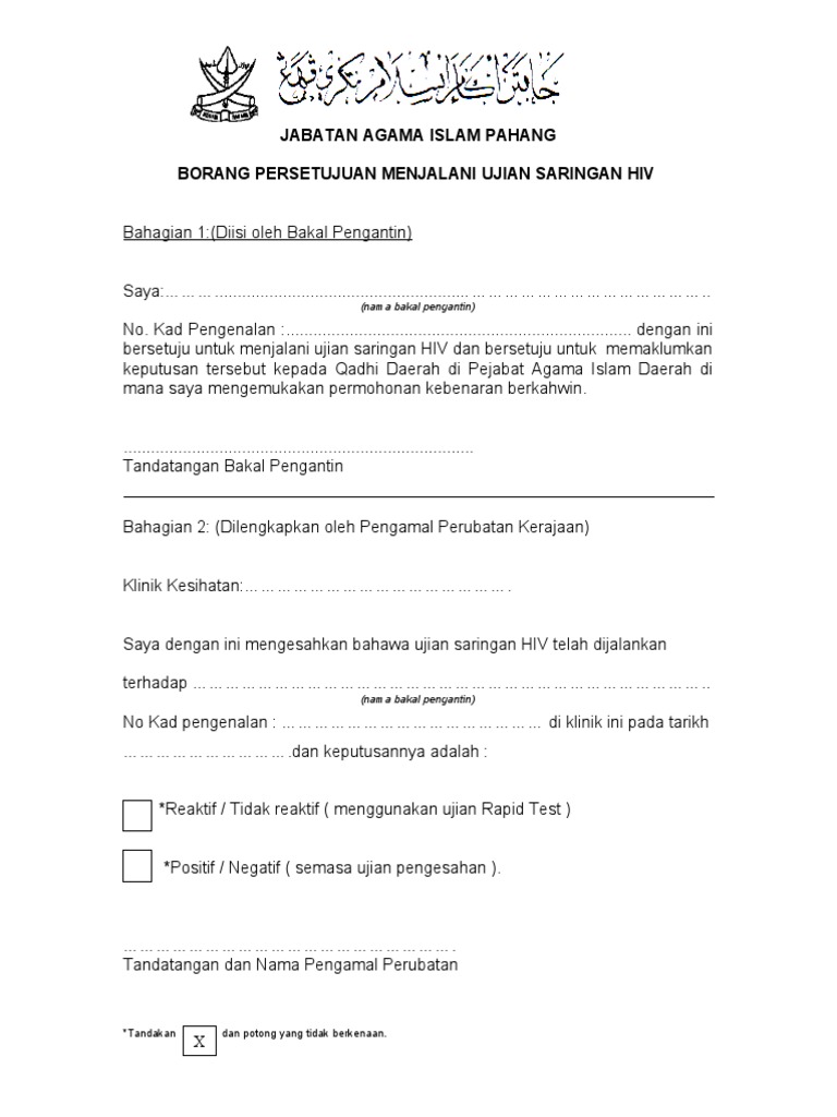 Tapi setahu ney pahang juga da mulakan sistem online baru baru ni. Jabatan agama islam pahang borang persetujuan menjalani ujian saringan hiv bahagian 1 diisi oleh bakal pengantin. Just butiran diri korang dan tarikh korang nak kawin tarikh tu penting sebab hiv test ni valid dalam tempoh 6 bulan saja awal dari 6 bulan tak di. After ambil borang tu aku straight go to poliklinik bandar jengka.