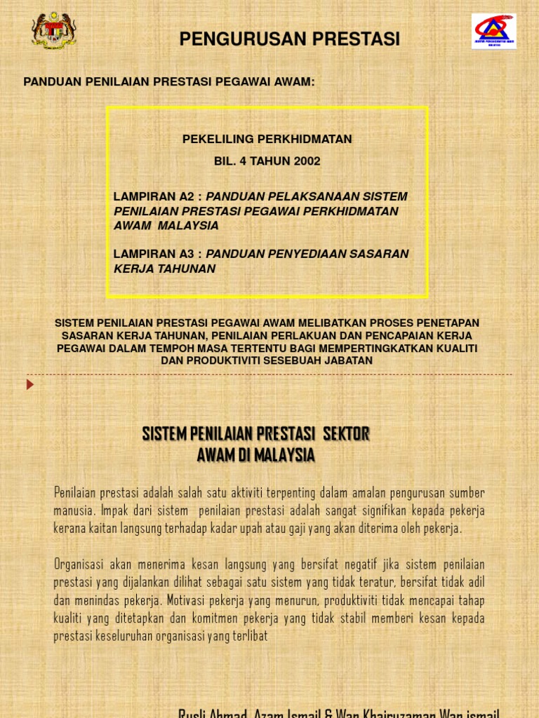 Prestasi 3 2002 untuk anggota pengurusan dan profesional. Laporan penilaian prestasi. Prestasi 4 2002 untuk anggota sokongan i. Kerajaan malaysia laporan penilaian prestasi pegawai kumpulan pengurusan dan profesional tahun.