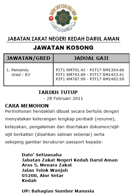 Maklumat kekosongan ini adalah seperti yang diiklankan. Jabatan zakat negeri kedah. Permohonan ini hendaklah dikemukakan bersama profil sekolah pondok salinan kad pengenalan pengetua atau guru besar sekolah. Borang permohonan jawatan kosong.