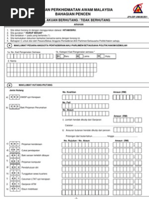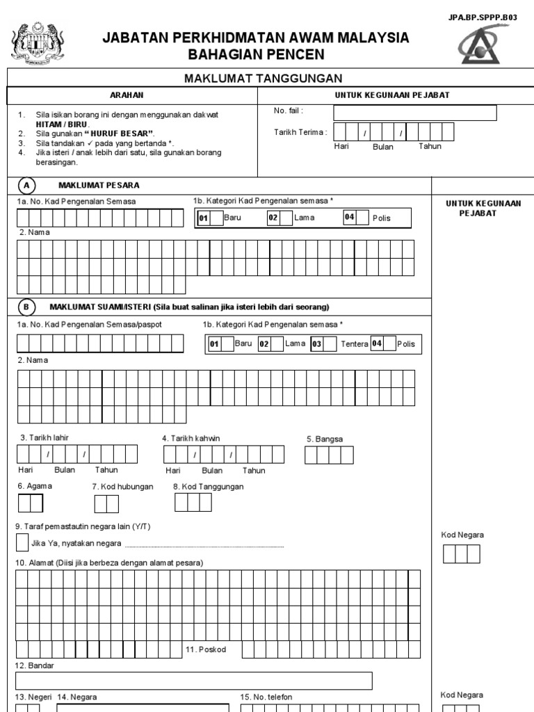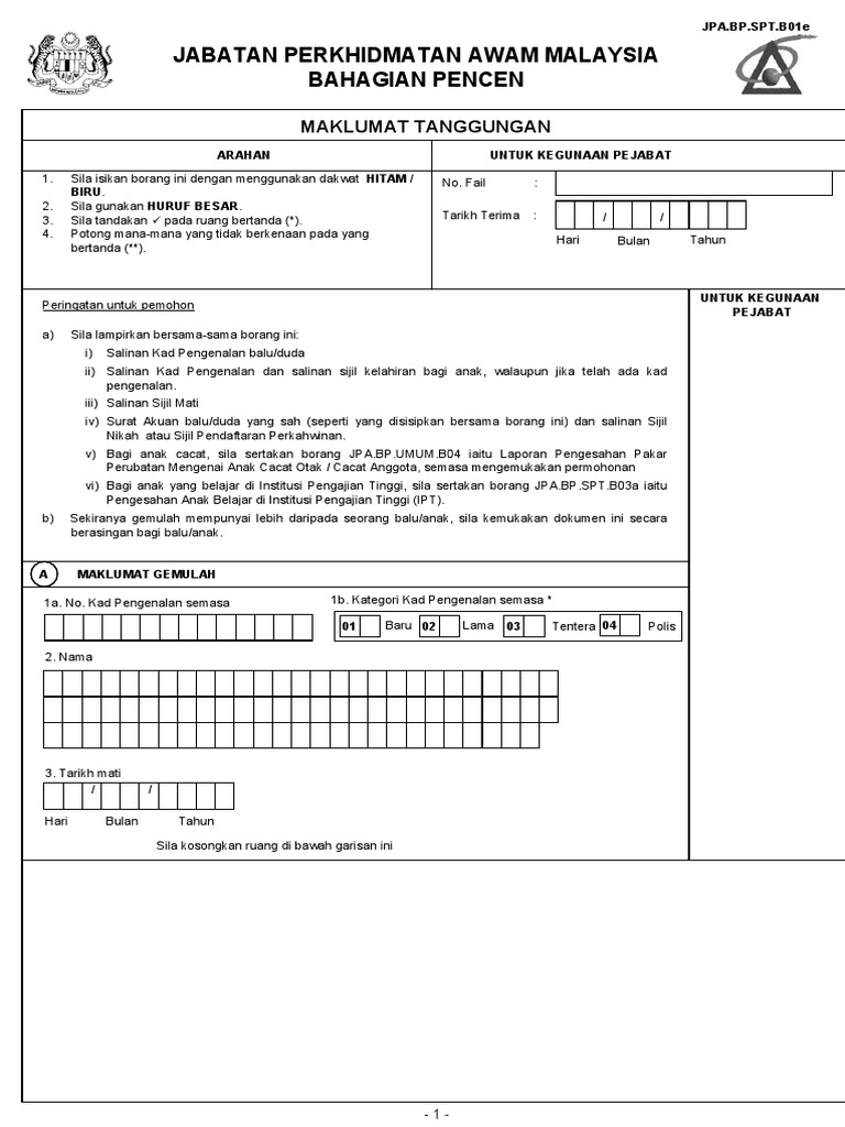 Borang jpa umum b01. Sila isikan borang ini dengan menggunakan dakwat hitam biru. Bahagian c untuk disi oleh pesara bekas anggota pentadbiran ahli parlimen setiausaha politik hakim sahaja.