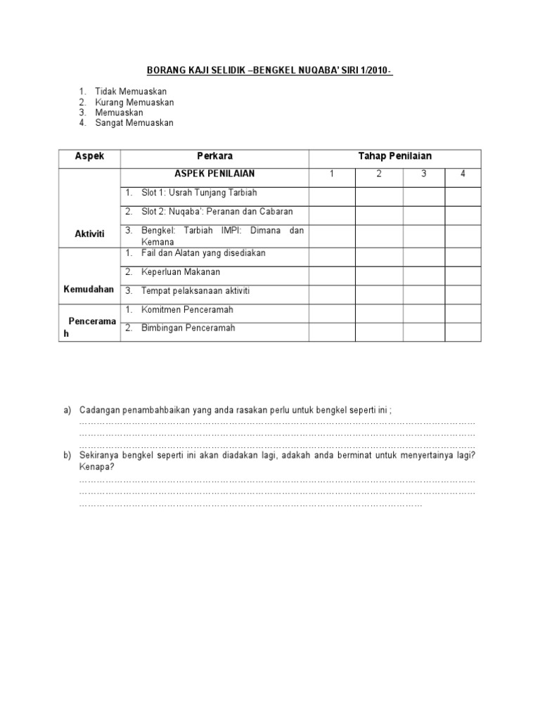 Borang kaji selidik bengkel. Borang soal selidik sebelum bengkel 2012. Umum mengetahui perintah kawalan pergerakan fasa ke 3 telah diumumkan oleh kerajaan malaysia mulai 15 april sehingga 28 april 2020 sekaligus telah menjejaskan pelbagai aktiviti pembelajaran secara. Contoh borang soal selidik bengkel motor contoh borang soal selidik bengkel kereta contoh borang soal selidik bengkel bubut contoh borang soal selidik bengkel hati contoh borang soal selidik bengkel print contoh borang soal selidik bengkel resmi contoh borang soal selidik geografi 2019 contoh borang soal selidik pengajian am contoh borang soal selidik kepuasan pelanggan contoh borang. Contoh borang soal selidik bengkel las contoh borang soal selidik geografi contoh borang soal selidik pengajian am contoh borang soal selidik kajian contoh borang soal selidik pelajar contoh borang soal selidik kepuasan pelanggan contoh borang penyertaan contoh borang pemarkahan pertandingan contoh borang keberhasilan guru contoh borang penilaian.