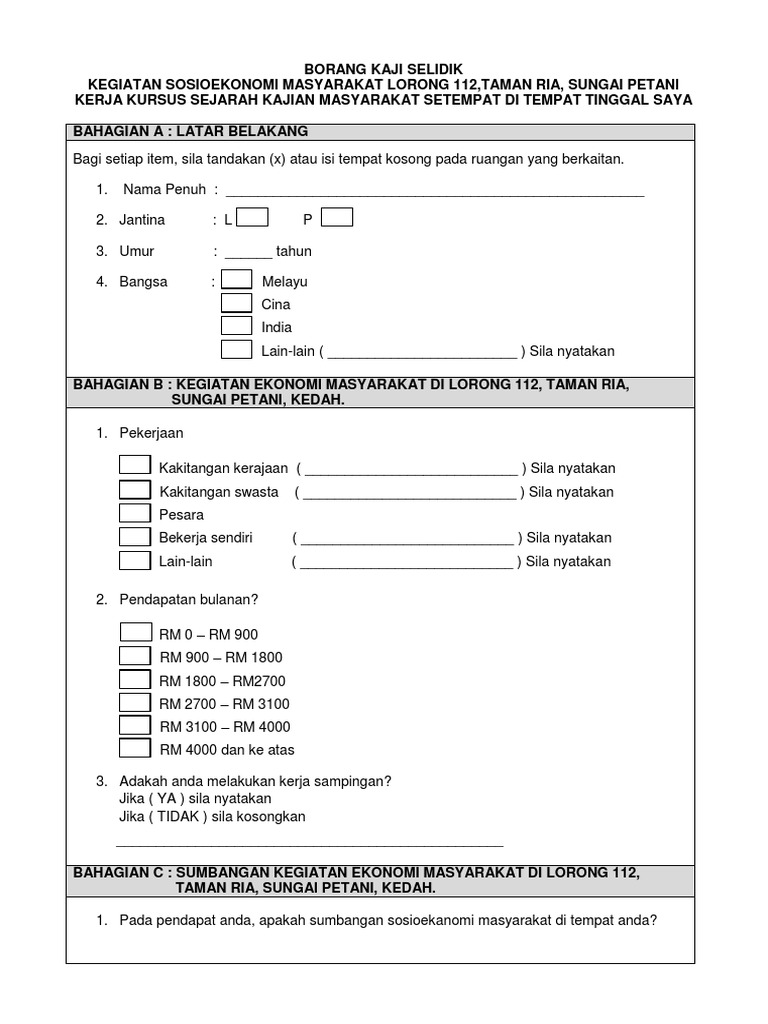 Borang kaji selidik masyarakat. Pilih hanya 1 kelas paling anda berminat untuk turut serta klik pada gambar. Soal selidik ini adalah bagi memenuhi metadologi kajian kami bagi kursus hubungan etnik zzzt2173. Borang ini terdiri daripada empat bahagian a b c dan d yang perlu dijawab oleh responden kajian. Borang soal selidik ini dan memberikan pandangan dan cadangan tambahan sekiranya ada.
