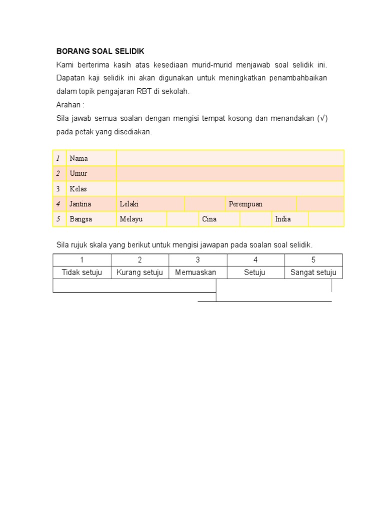 Borang kaji selidik sekolah rendah. Borang soal selidik borang soal selidik ini dikemukakan untuk mendapatkan maklum balas dan menilai persepsi masyarakat melayu di daerah pengkalan hulu perak terhadap haiwan. Borang soal selidik tajuk kajian. Pelaksanaan kurikulum standard sekolah rendah tay meng guat kirar ak sare litat bilung jabatan pengajian melayu abstrak kajian ini bertujuan untuk meninjau tahap kesediaan pelajar institut pendidikan guru dari apek minat sikap pengetahuan dan kemahiran dalam pelaksanaan kurikulum standard sekolah rendah kssr. Penguasaan rukun solat menerusi kem bestari solat kbs.