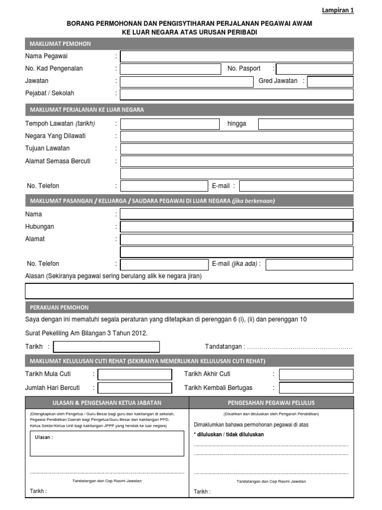 Untuk penjawat awam yg nak ke oversea khususnya guru guru yang banyak cuti cuti panjang tu di sini nak diberikan contoh borang permohonan ke luar negara. 2 saya dengan ini mengisytiharkan segala maklumat yang diberikan adalah benar. Maklumat pasangan keluarga saudara pegawai di luar negara nama. Alasan sekiranya pegawai sering berulang alik ke negara jiran perakuan pemohon tarikh.