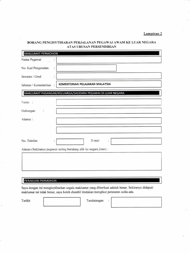 I kelulusan kementerian dalam negeri dan kementerian luar jika persidangan seminar lawatan rasmi itu diadakan di negara komunis j saya mengesahkan bahawa maklumat maklumat di atas adalah benar. Borang permohonan perlindungan insurans kesihatan ke luar negara negara ketiga borang permohonan kemudahan perlindungan insurans kesihatan ke luar negara negara ketiga atas urusan persendirian di bawah pekeliling perkhidmatan bilangan 6 tahun 2015 arahan. Maklumat perjalanan ke luar negara. Maklumat hendaklah dilengkapkan dengan jelas dan menggunakan huruf besar.