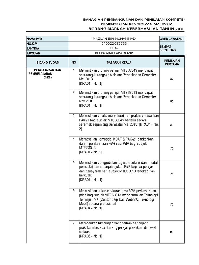 Guru pemulihan khas menyediakan rancangan pengajaran tahunan rpt. Borang keberhasilan guru 2020 di malaysia jikalau dahulu kalangan guru di malaysia akan dinilai melalui sistem laporan nilaian prestasi tahunan lnpt. Folder pengurusan dan penyelarasan standard program pemulihan khas. Ada perubahan sikit dari tahun tahun lepas kerana mengikut pk hem baru yang inginkan 5 item dimasukkan dalam keberhasilan untuk pengurusan setiausaha sub unit hem.