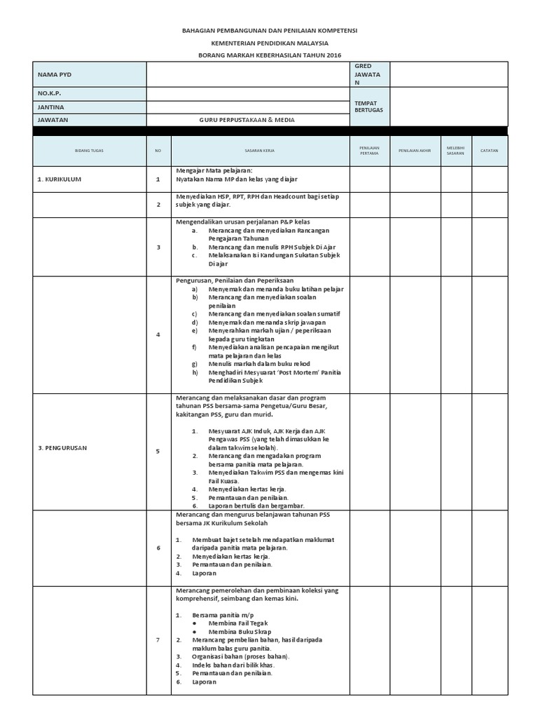 Berikut kami kongsikan borang keberhasilan guru perpustakaan media bagi tujuan penilaian bersepadu pegawai perkhidmatan pendidikan 2016 pbppp. Elemen keberhasilan di dalam penilaian tersebut menjadi bualan hangat di media media sosial. Perkongsian ini mengandungi contoh bagi 41 jawatan di perkhidmatan pendidikan.