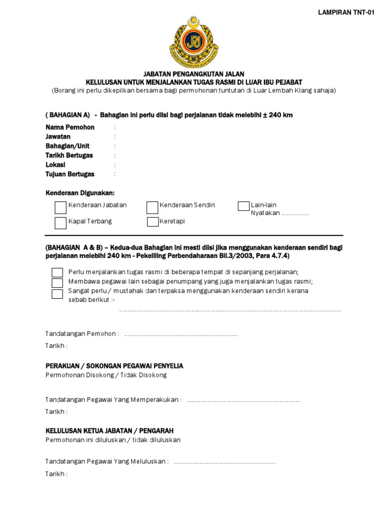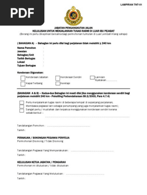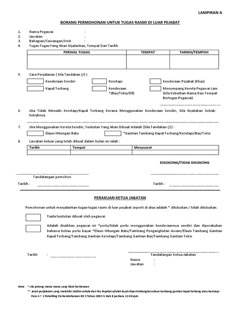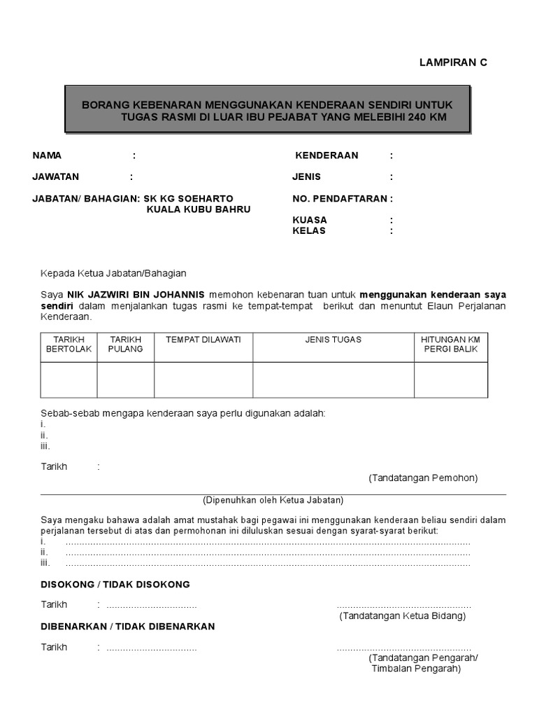 1 borang tuntutan hendaklah lengkap. Borang permohonan untuk menggunakan kereta sendiri dan menuntut elaun kilometer bagi jarak melebihi 240 kilometer sehala pekeliling perbendaharaan bil. Jarak perjalanan yang melebihi 240 km sehala dari ibu pejabat adalah layak dipertimbangkan elaun tambang gantian kapal terbang atau keretapi. Saya memohon untuk menjalankan tugas tugas rasmi di luar ibu pejabat tersebut dengan menggunakan kenderaan sendiri oleh sebab sebab berikut i menjalankan tugas tugas rasmi yang lain di beberapa tempat sepanjang perjalanan tersebut.