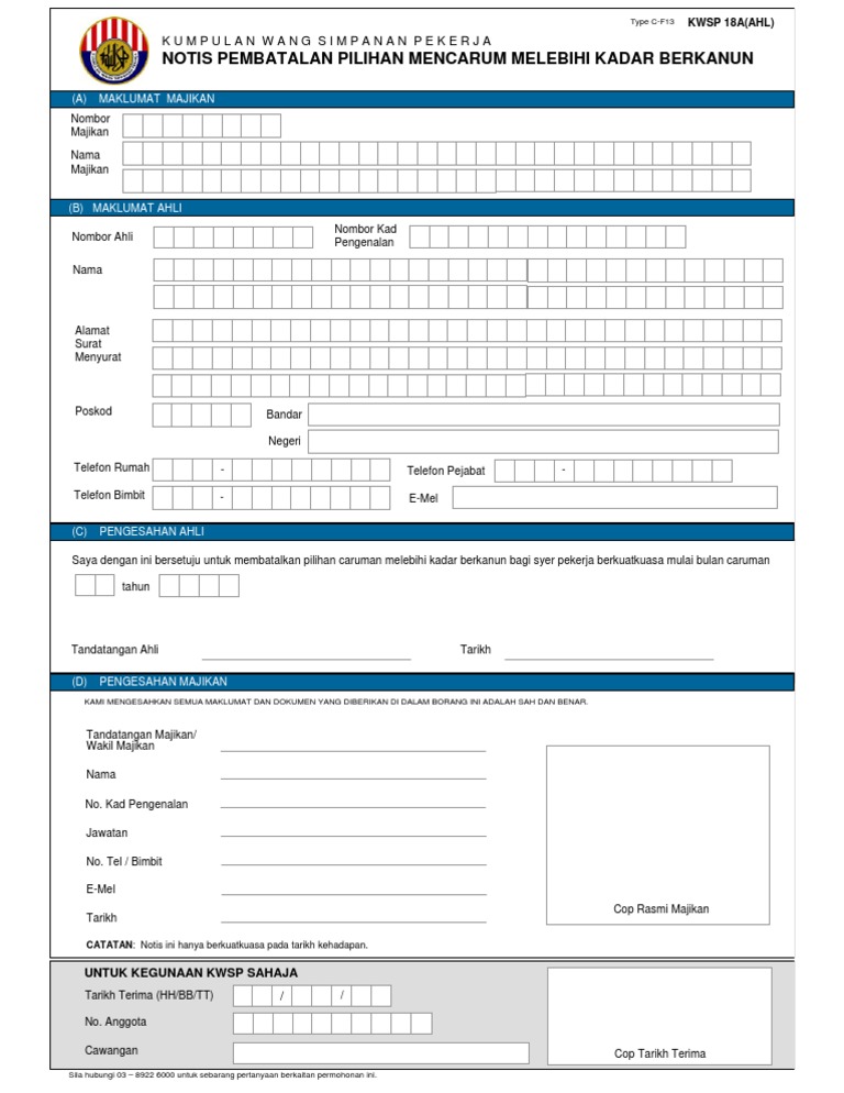 1 self employed 2 pensionable workers 3 non employees 4 non employers. Untuk membatalkan pilihan mencarum melebihi kadar berkanun majikan hendaklah mengemukakan notis pembatalan melalui borang kwsp 18a ahl dan kwsp 18 maj. Permohonan tanpa borang ini hanyalah untuk pengeluaran yang berikut. Kwsp 18a ahl pembatalan mencarum melebihi kadar berkanun yang ditetapkan ahli kwsp 1314.