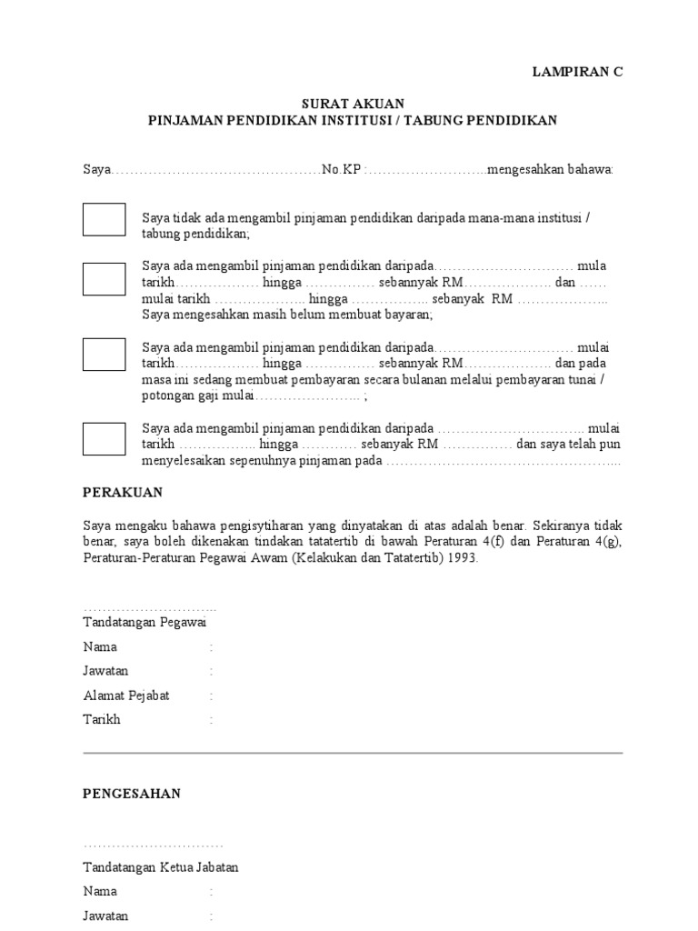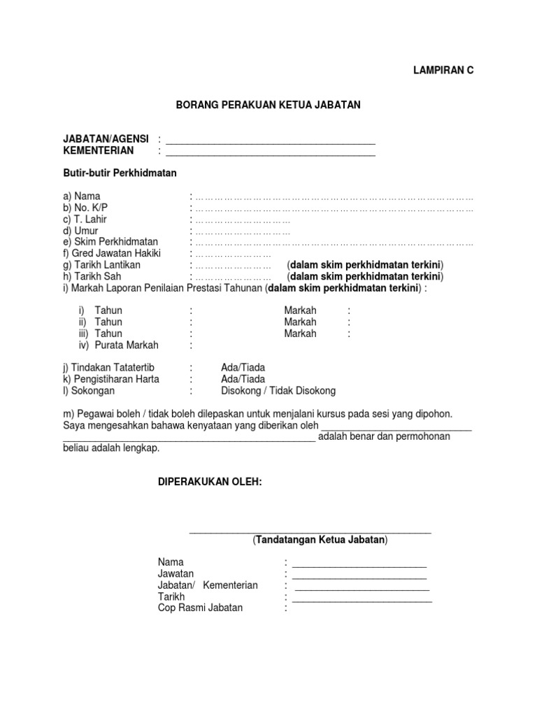 Borang lampiran c kenyataan ketua jabatan. Surat akuan pinjaman pendidikan 793 muat turun bahan. Lampiran c borang perakuan ketua jabatan jabatan agensi. Lampiran b borang pemeriksaan perubatan ms 1 720 muat turun bahan. Telah mengisytiharkan harta kepada ketua jabatan dan.