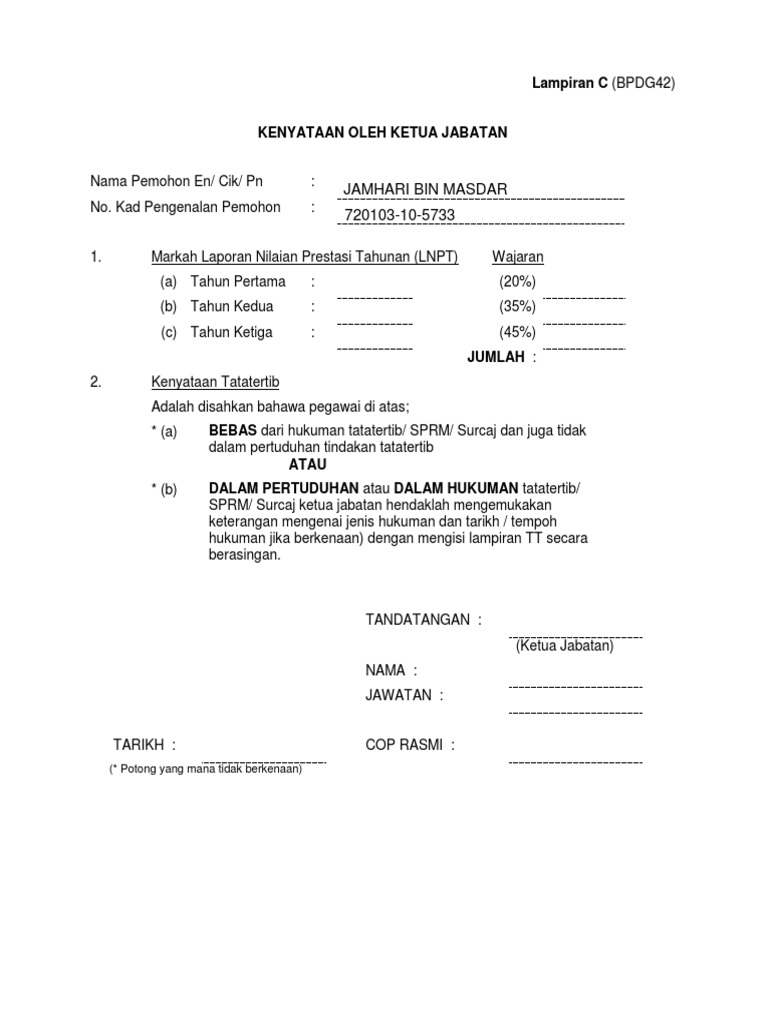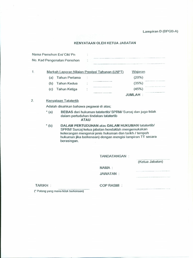 Lampiran a pengesahan ketua jabatan untuk diisi oleh ketua jabatan bagi permohonan pegawai sedang berkhidmat arahan sila isi ruangan yang disediakan kod jenis hukuman tatatertib yang dikenakan kepada pegawai. Borang perakuan ketua jabatan created date. Lampiran c borang perakuan ketua jabatan jabatan agensi. Peminjam bagi polis sahaja yang diakui sah oleh ketua jabatan.