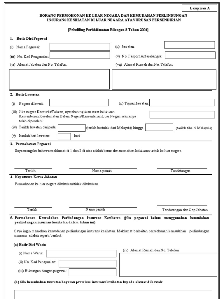 Borang pengisytiharan perjalanan pegawai awam ke luar negara atas urusan persendirian maklumat pemohon nama pegawai. Pegawai perlu mendapatkan kelulusan ke luar negara daripada ketua jabatan dan kemudahan perlindungan insurans kesihatan dengan menggunakan borang seperti di lampiran a. Memastikan telah menerima sijil dan kad insurans kesihatan sebelum memulakan perjalanan ke luar negara negara ketiga. Ya contoh kes ada dlm buku setitik nila e book dari jpa yg ada himpunan contoh kes2 tatatertib yg jadi buku rujukan aku gak skang ni.