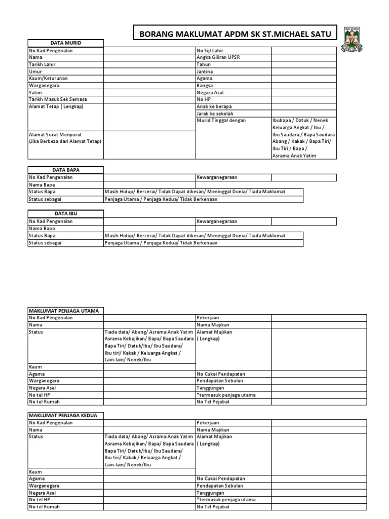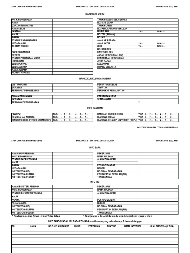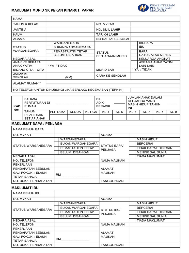 Borang maklumat murid untuk sekolah di malaysia. Adik beradik anak ke berapa hubungan dengan murid status murid anak yatim ya tidak status penjagaan murid ibu bapa penjaga jarak rumah ke sekolah cara ke sekolah cita cita pernah memasuki prasekolah tadika. Murid berkeperluan khas. Sila isi semua maklumat dengan menggunakan huruf besar tandakan pada yang berkenaan.