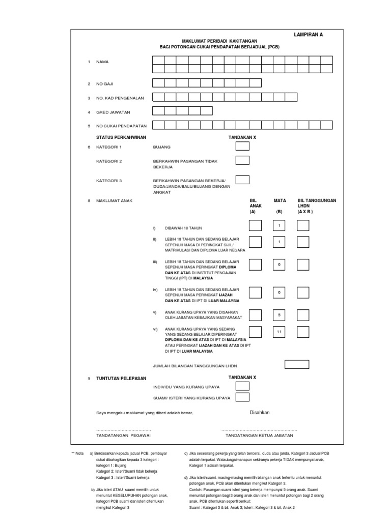 Borang maklumat peribadi pcb. Borang mengemas kini maklumat peribadi bagi tujuan pengiraan potongan cukai bulanan pcb 1 nama. Saya mengaku maklumat yang diberikan adalah benar nota a berdasarkan kepada jadual pcb pembayar c jika seseorang pekerja yang telah bercerai duda atau janda cukai dibahagikan kepada 3 kategori. Borang maklumat berkaitan penggajian dengan majikan majikan terdahulu dalam tahun semasa bagi tujuan pcb. Lampiran a borang kemaskini maklumat peribadi pcb 2017 klik untuk muat turun.
