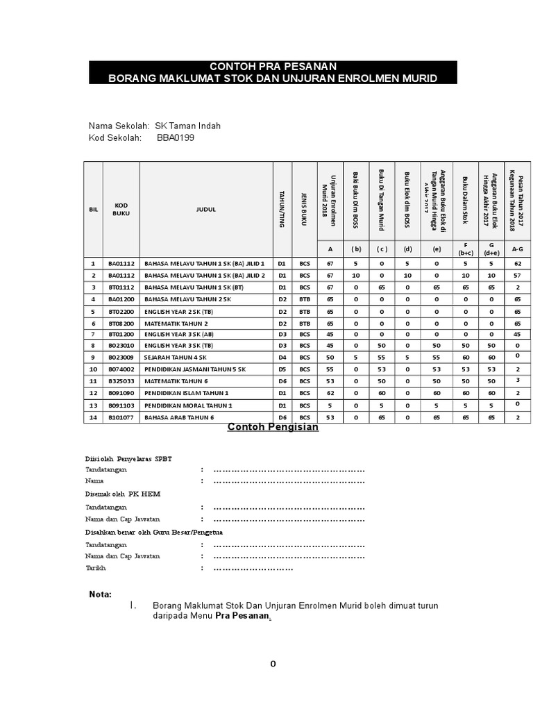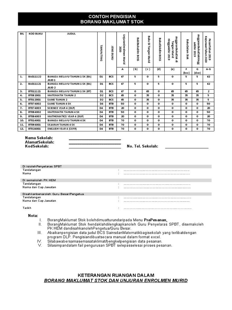 Borang maklumat stok buku unjuran murid. Maklumat penggunaan buju teks. Lampiran g borang maklumat stok buku dan unjuran murid v. Maklumat stok buku dan borang unjuran enrolmen murid. Borang ini diperlukan untuk memudahkan sekolah untuk mengisi data pesanan ke dalam sistem dan membuat pesanan dengan tepat.