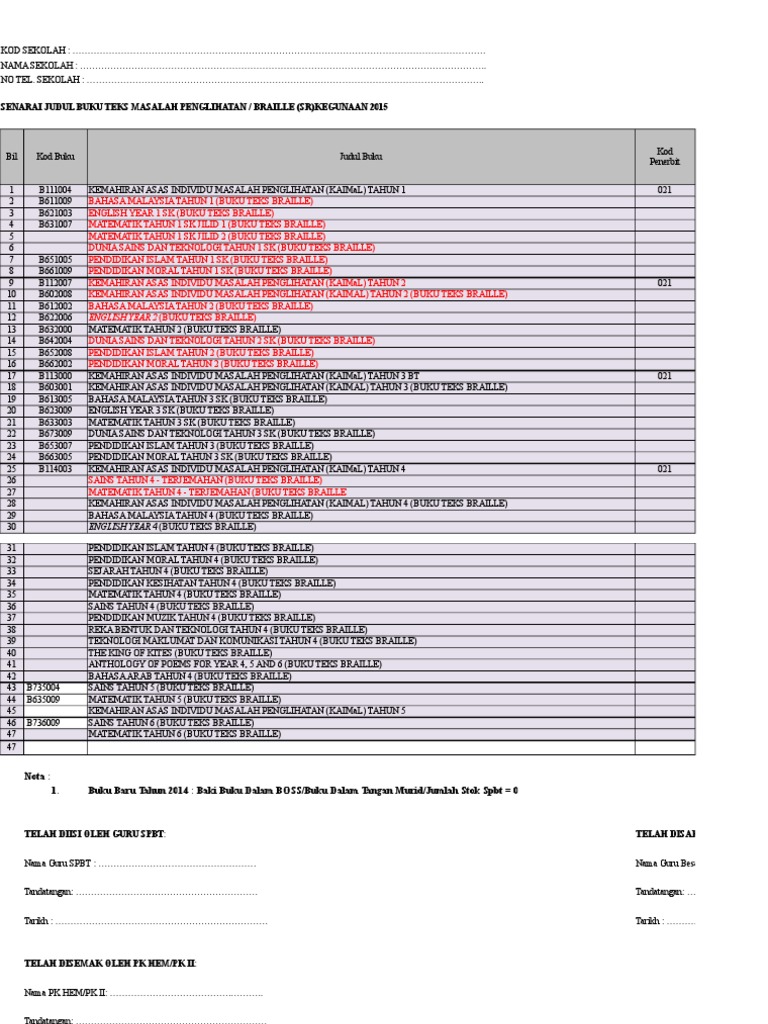 Penyata btbtr btbtb 460 spbt tahun semasa. 1 3 memastikan agihan dalaman kekurangan dan lebihan buku teks antara sekolah dan bosd telah dilaksanakan terlebih dahulu sebelum pengisian data dalam borang maklumat. Buku di tangan murid. Baki buku dalam boss.