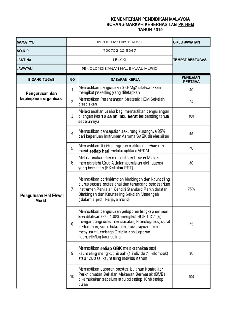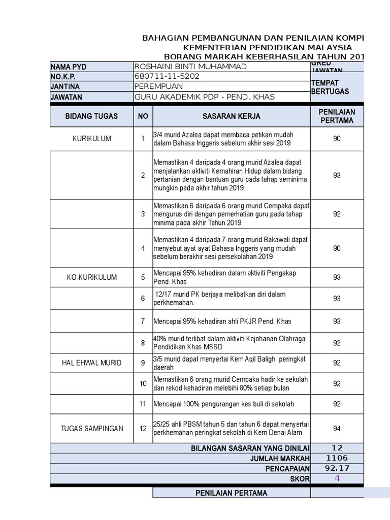 Borang keberhasilan guru 2019. Pada penghujung tahun pula penilaian dilakukan sekali lagi ke atas keberhasilan ini dengan penilai memberi markah terhadap sesuatu item sama ada tidak mencapai mencapai atau melebih sasaran. Hari ini nak kongsi borang keberhasilan saya untuk tahun 2020 pula. Borang keberhasilan guru akademik biasa.