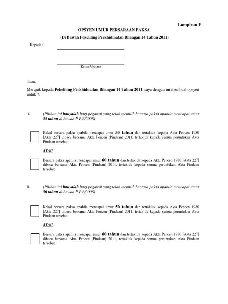 Pilihan ini hanyalah bagi pegawai yang telah memilih bersara paksa apabila mencapai umur 55 tahun di bawah p p 6 2008 kekal bersara paksa apabila mencapai umur. Pemakaian kepada pegawai yang tidak bersetuju menerima sbpa 27. Opsyen umur persaraan paksa di bawah pekeliling perkhidmatan bilangan 11 tahun 2011 lampiran f ketua jabatan tuan merujuk kepada pekeliling perkhidmatan bilangan 11 tahun 2011 saya dengan ini membuat opsyen untuk. Pekeliling perkhidmatan bilangan 14 tahun 2008 author.
