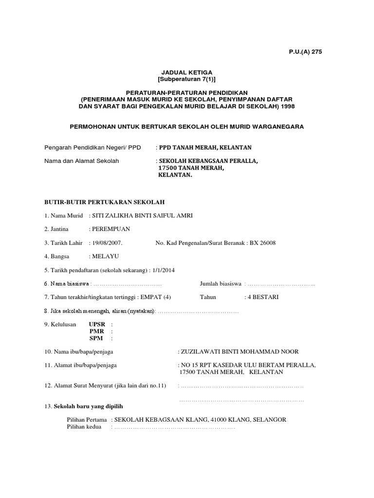 I tiga salinan borang ini hendaklah dihantarkan bersama dengan butir butir yang dikehendaki dalam bahagian i. Bawa surat ni ke jabatan pelajaran unit sekolah menengah bagi yang sekolah menengah. P u a 275 jadual ketiga subperaturan 7 1 peraturan peraturan pendidikan penerimaan masuk murid ke sekolah penyimpanan daftar dan syarat bagi pengekalan murid belajar di sekolah 1998 permohonan untuk bertukar sekolah oleh murid warganegara pengarah pelajaran negeri. Nama dan alamat sekolah.