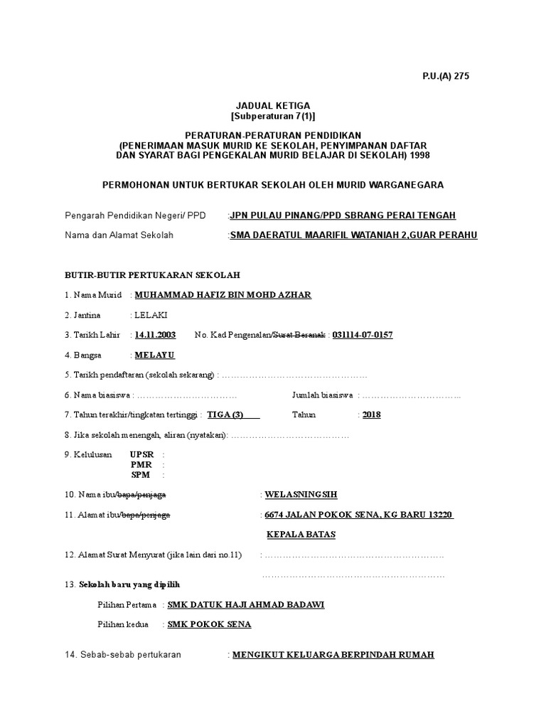 P u a 275 ruj. P u a 275 jadual ketiga subperaturan 7 1 peraturan peraturan pendidikan penerimaan masuk murid ke sekolah penyimpanan daftar dan syarat bagi pengekalan murid belajar di sekolah 1998 permohonan untuk bertukar sekolah oleh murid warganegara pengarah pelajaran negeri. Nama dan alamat sekolah asal. Hanya ibu bapa atau penjaga yang sah dari undang undang dibenarkan membuat permohonan ini.
