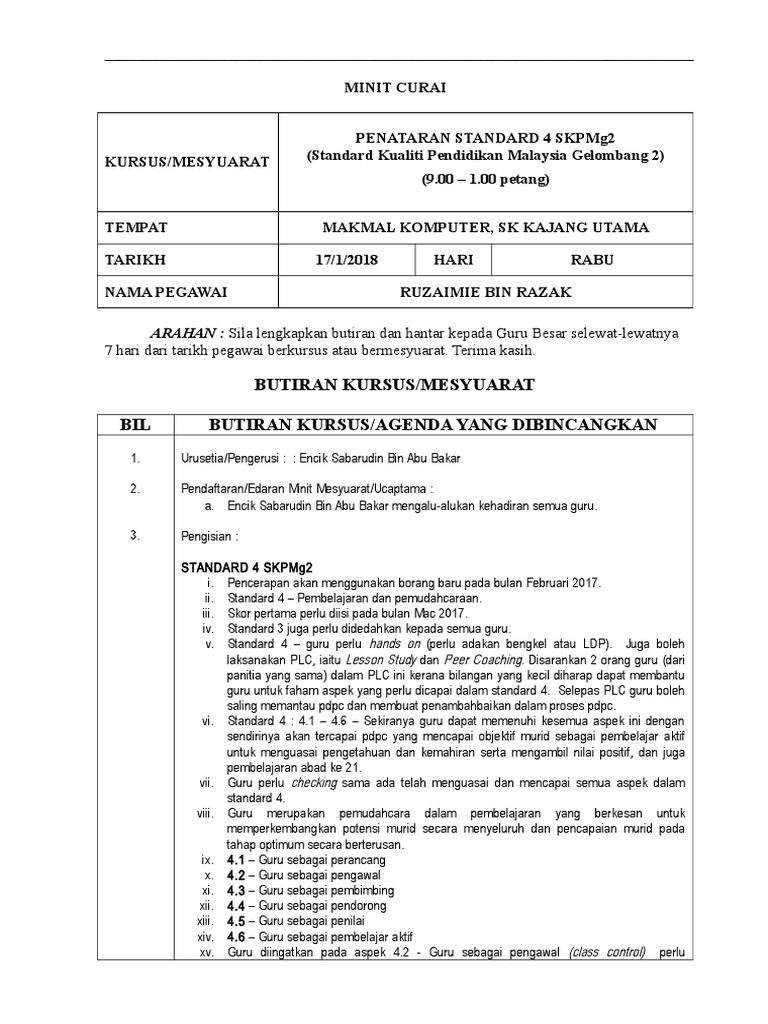 Borang pengskoran pdpc standard 4 skpmg2 ataupun standard kualiti pendidikan malaysia gelombang 2 adalah merupakan penggubalan semula skpm 2010 dengan beberapa penambahbaikan hasil daripada beberapa siri kajian dan mesyuarat. Borang instrumen pemantauan pdp guru di dalam kelas skpm standard 4 16. Draf skpmg2 yang dikeluarkan pada 13 september 2016 oleh jemaah nazir dan jaminan kualiti ini merupakan piawai yang digunakan bagi menentukan tahap pencapaian kualiti pendidikan mencakupi beberapa bidang seperti kepimpinan pengurusan organisasi pengurusan kurikulum kokurikulum dan hal ehwal murid pembelajaran dan pemudahcaraan dan kemenjadian murid. Buku program mesyuarat pibg.