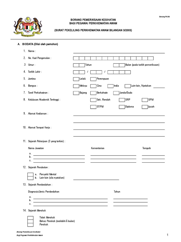 1 borang pk 03 borang pemeriksaan kesihatan bagi pegawai perkhidmatan awam surat pekeliling perkhidmatan awam bilangan 3 2003 a. 1 2013 borang permohonan pemeriksaan perubatan untuk pelantikan ke dalam perkhidmatan awam pemohon hendaklah mengisi maklumat di bahagian a b dan dan menyerahkan borang ini c berserta surat tawaran pelantikan kepada pengamal perubatan berdaftar sebelum pemeriksaan perubatan dibuat. Total cholesterol mmol l nota. Biodata diisi oleh pemohon 1.