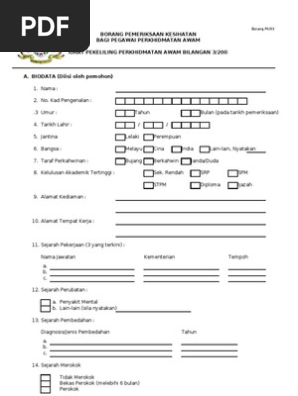 Rawak random mmol l atau puasa fasting mmol l 2. Borang pemeriksaan kesihatan jusa author. Borang pemeriksaan kesihatan bagi pegawai perkhidmatan awam surat pekeliling perkhidmatan awam bilangan 3 2003 a. Pemeriksaan kesihatan bagi pegawai perkhidmatan awam.