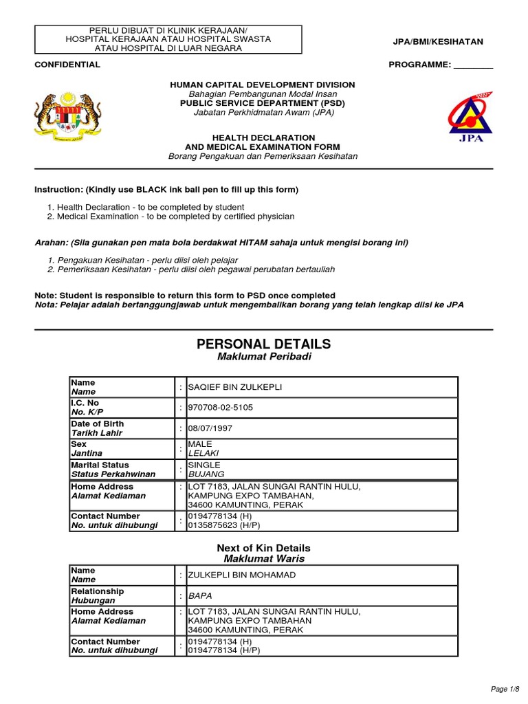Calon bermaksud seseorangyang telah ditawarkan pelantikan secara. Confidential medical report on applicant for overseas training in applying for admission to full time course of. Borang pengakuan dan pemeriksaan kesihatan jpa pegawai keluarga kesihatan universiti iv. Laporan pemeriksaan kesihatan bahagian ini perlu diisi oleh pegawai perubatan sila gunakan borang pemeriksaan kesihatan pk 03 seperti di lampiran.