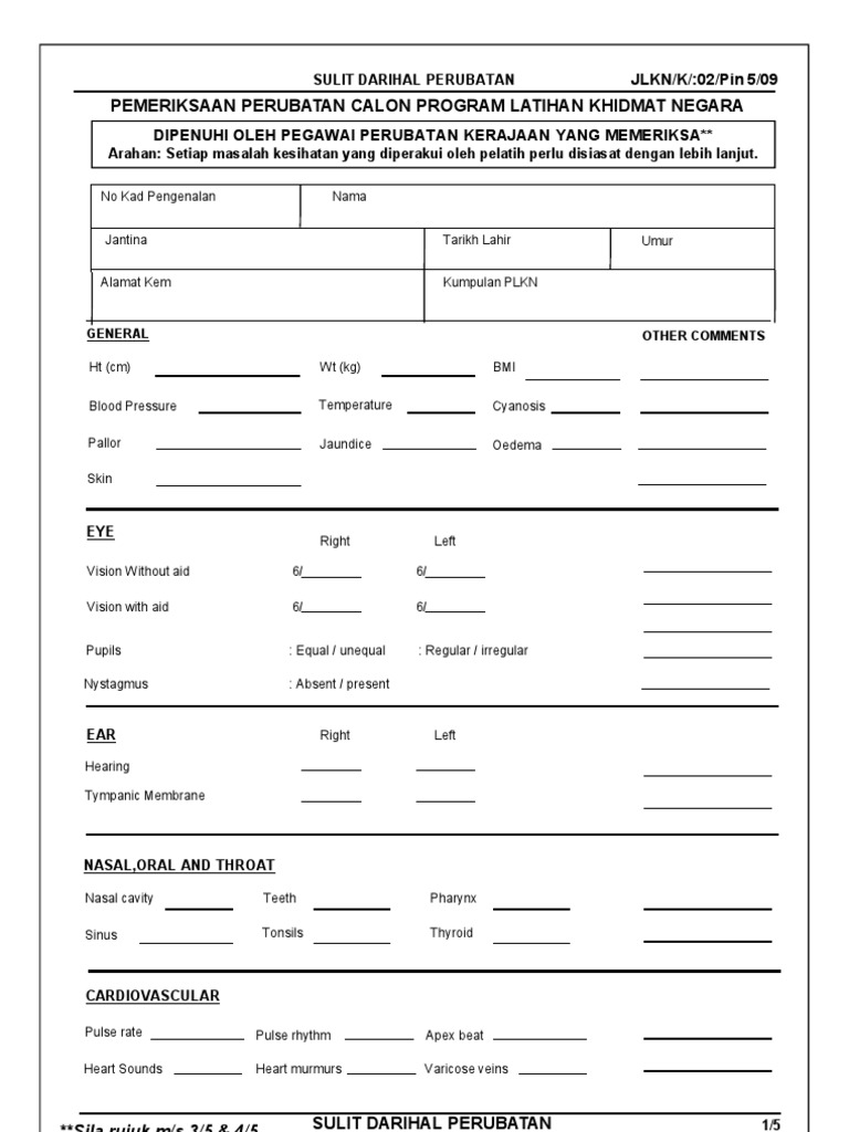 Malaysia pekeliling perkhidmatan bilangan 3 tahun 2003 pemeriksaan kesihatan bagi pegawai perkhidmatan awam. Calon bermaksud seseorangyang telah ditawarkan pelantikan secara. Pemeriksaan klinikal payudara. 3 4 carta alir di muka surat 3 borang pemeriksaan perubatan calon plkn jlkn k 02 pin 5 09 boleh dirujuk sebagai garispanduan bagi membuat keputusan klinikal hasil pemeriksaan perubatan calon plkn.