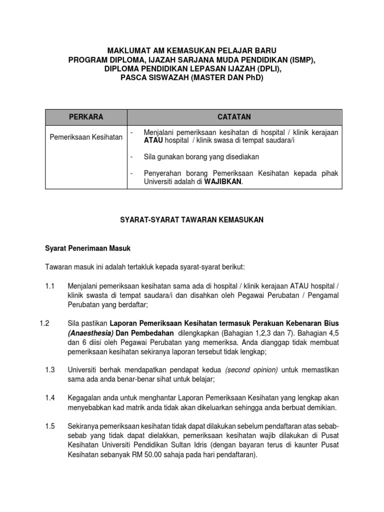 1 2013 borang permohonan pemeriksaan perubatan untuk pelantikan ke dalam perkhidmatan awam pemohon hendaklah mengisi maklumat di bahagian a b dan dan menyerahkan borang ini c berserta surat tawaran pelantikan kepada pengamal perubatan berdaftar sebelum pemeriksaan perubatan dibuat. Memberi persetujuan untuk anak menjalani pemeriksaan kesihatan dan imunisasi secara atas talian. Status kesihatan peserta adalah bergantung kepada penilaian pegawai perubatan medical judgement atas setiap individu. Kerajaan seri paduka baginda.